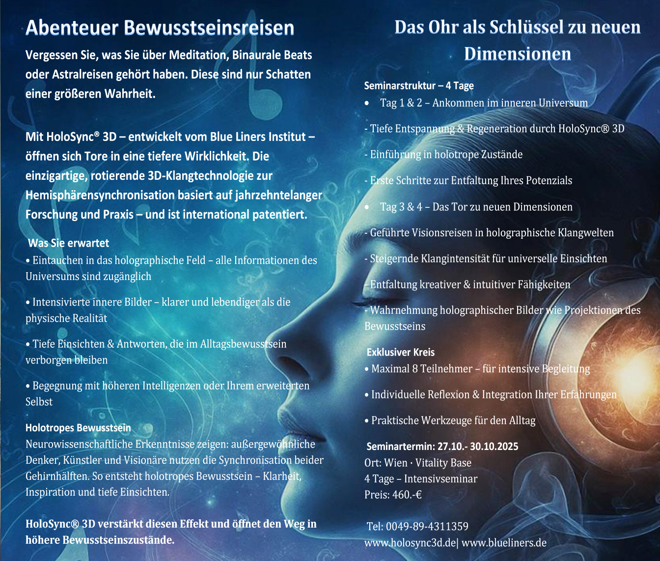 Nach über 10 Jahren intensiver Erprobung mit speziellen Holonauten bieten wir nun auch Aufbauseminare für erfahrene Teilnehmer an, die bereits den Grundkurs abgeschlossen haben und ihre Reisen in noch tiefere Bewusstseinszustände vertiefen möchten. Diese Aufbauseminare bieten wir in 3, 4 oder 5 Tagen an.