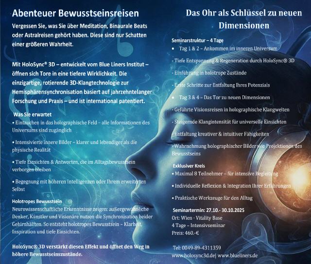 viele Menschen haben bereits wertvolle Erfahrungen mit unseren HoloSync® 3D-Seminaren gesammelt. Die zahlreichen positiven Rückmeldungen zeigen uns, dass sich die beeindruckenden, bewusstseinserweiternden Erlebnisse oft auch über die Seminare hinaus fortsetzen. Auch in diesem Jahr bieten wir wieder die Möglichkeit, Ihre persönlichen Grenzen zu erweitern und aufregende neue Erfahrungen zu sammeln.